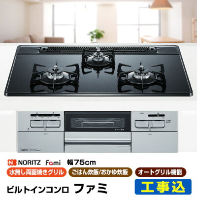 【楽天リフォーム認定商品】【工事費込セット(商品+基本工事)】[N3WQ7RWASSI-LPG] 【プロパンガス】 ノーリツ ビルトインコンロ Fami ファミ オートタイプ ダブル高火力 幅75cm 無水両面焼きグリル ブラックガラストップ 【送料無料】